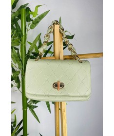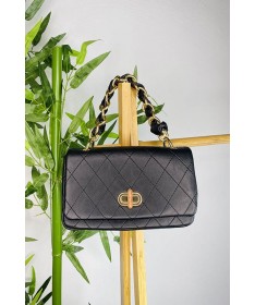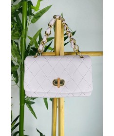Bolso de material con formas de rombos. Cadena y asa larga de material.