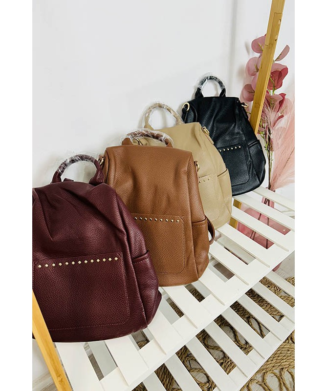 Mochila de material con bolsillo delantero y detalle de tachuelas.