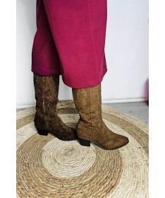 Botín de ante tipo cowboy. Detalle de bordados.