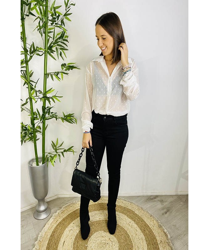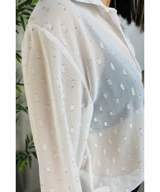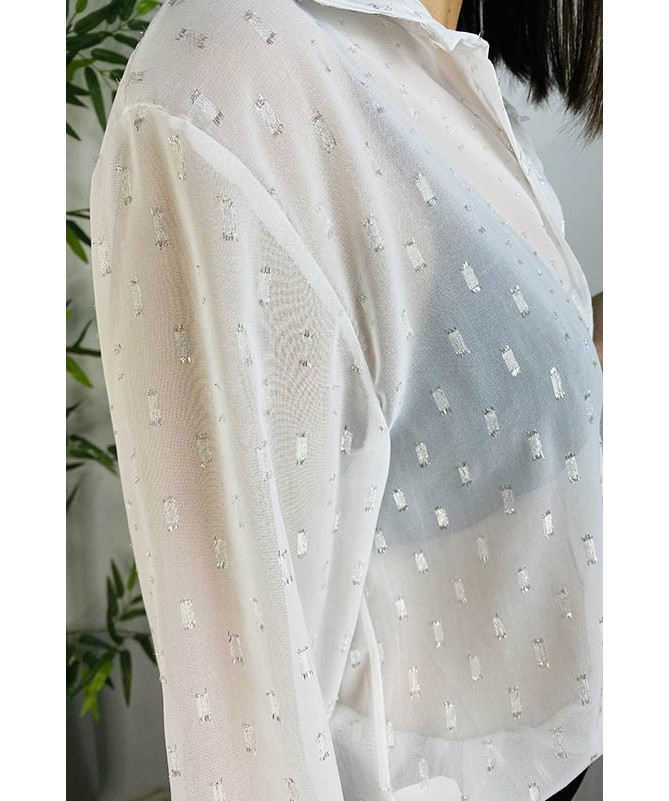 Camisa en tejido de gasa transparente. Detalles de cuadros en tonos dorados. Talla única.