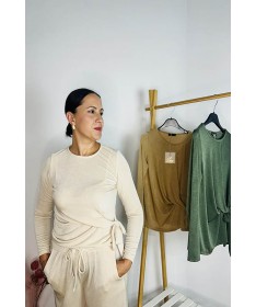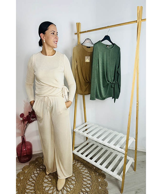 Camiseta en tejido fluido con hilo de tono dorado. Lazada lateral y talla única (36 a 40).
