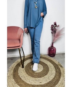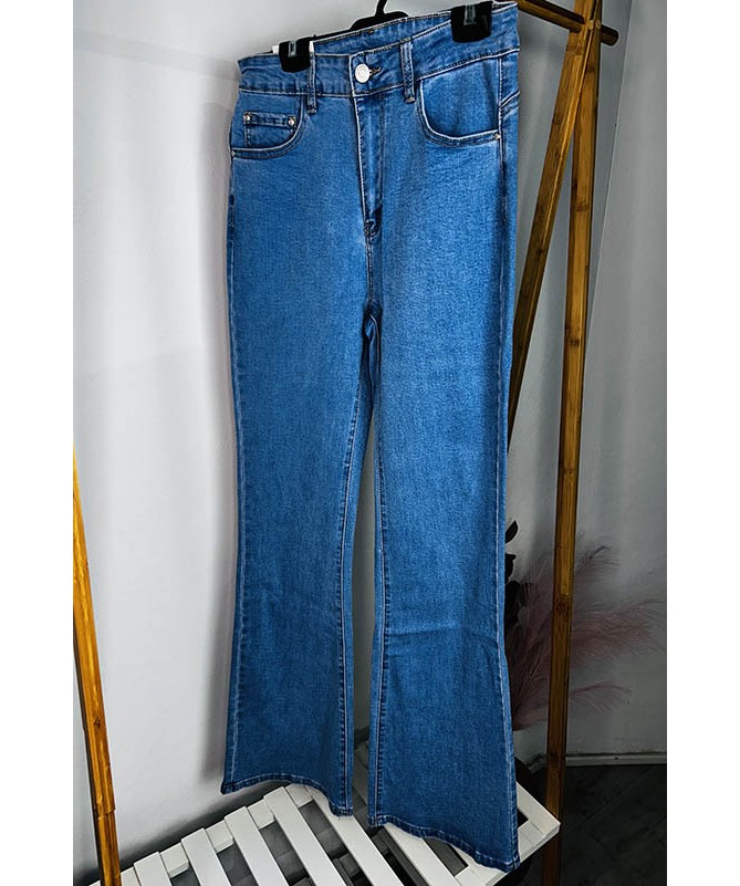 Jeans de forma de campana o flare. Tallaje grande, tejido elástico.