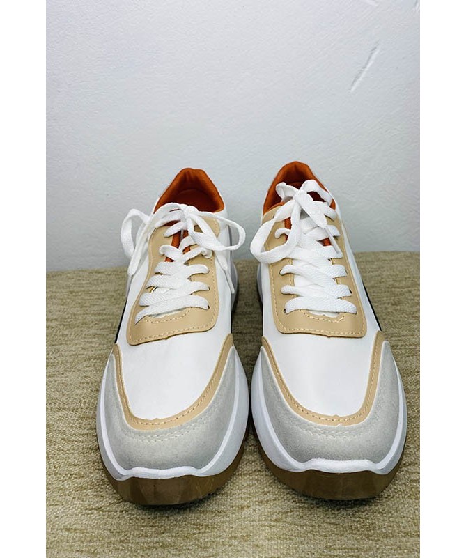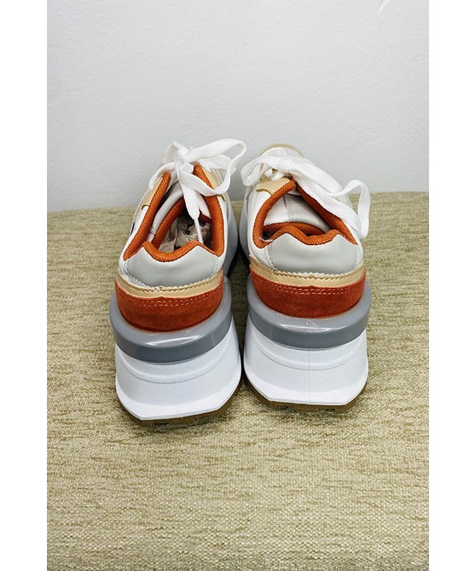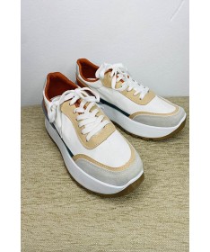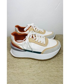 Zapatilla de suela alto y con alza por dentro. Su tono es blanco y combina gris, verde y caldero.