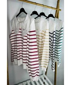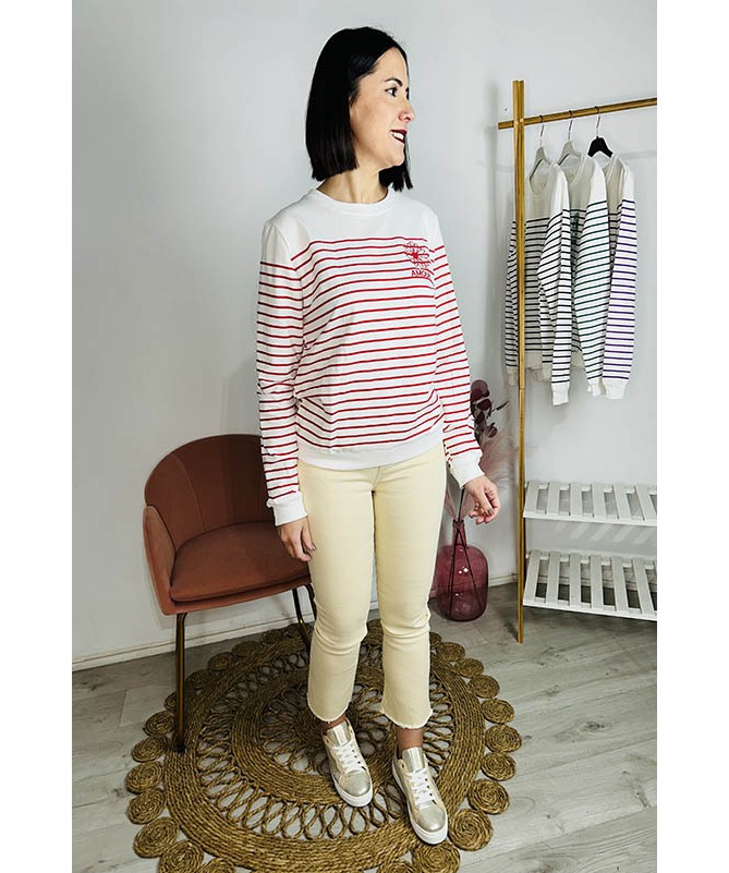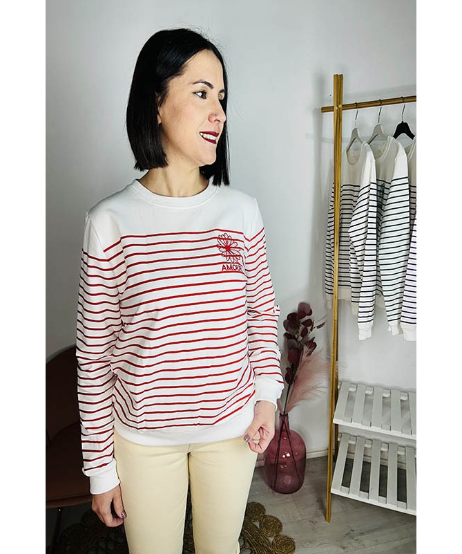 Sudadera en tejido estampado de rayas. Letras amour con dibujo de una flor.