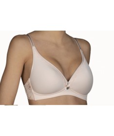 Sujetador actual y moderno sin aro y con relleno, encaje en los laterales y pequeño detalle de lazo y corazón en el centro. Tirantes regulables.