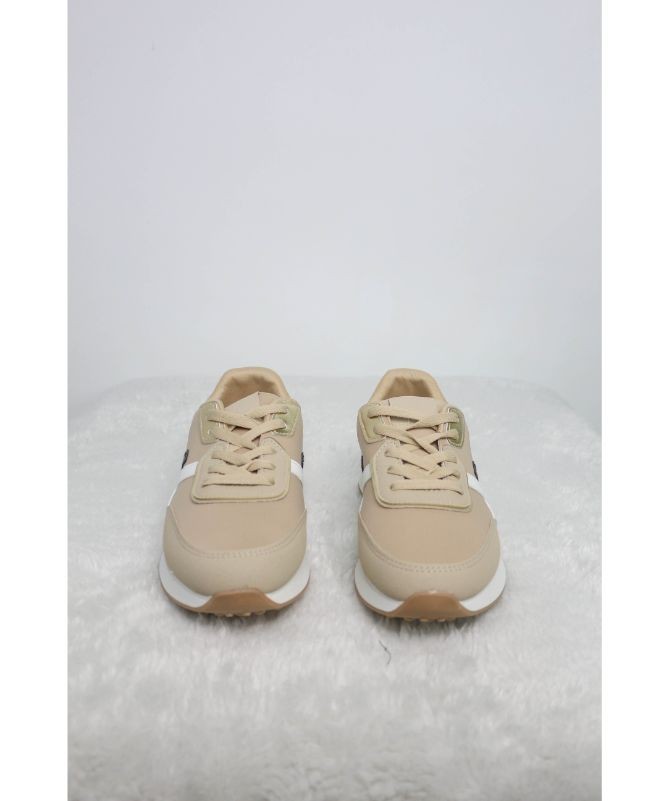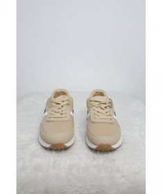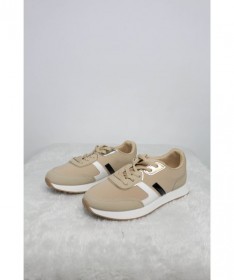Zapatilla de mujer en color camel con un toque de marrón. Su tejido es básicamente tela.