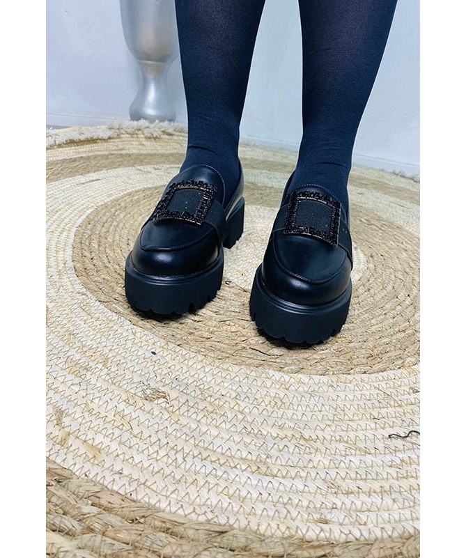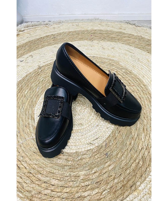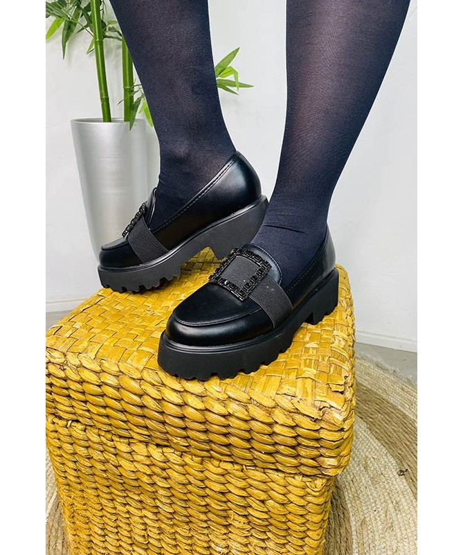 Mocasín de polipiel con suela de plataforma. Hebilla cuadrada cogida con elástico. Detalle de piedras negras.
